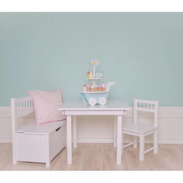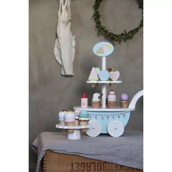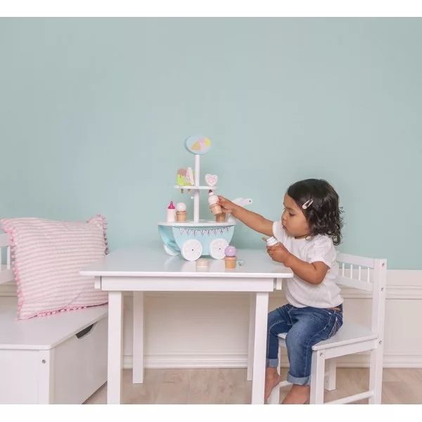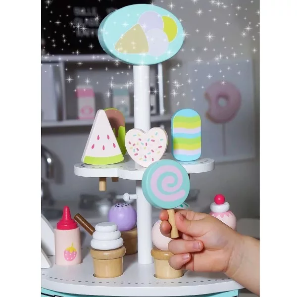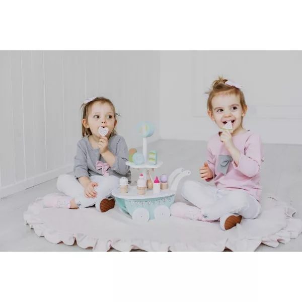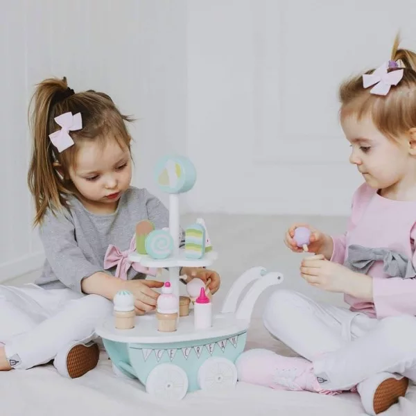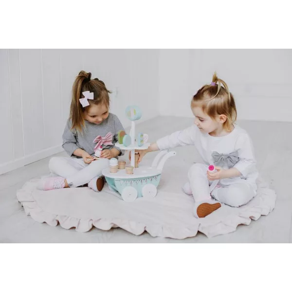Drewniana lodziarnia na kółkach – to gwarancja udanej, kreatywnej i smacznej zabawy! Wszystkie dzieci uwielbiają lody – mobilny wózek z lodami, pozwoli na serwowanie ulubionych smakołyków wszystkim misiom, lalom i członkom rodziny. Zabawa w dom, sklep czy lodziarnię świetnie pobudza dziecięcą wyobraźnię, rozwija słownictwo a nakładanie lodów ćwiczy sprawność manualną i koordynację ręka-oko. Świetny zestaw na prezent!
