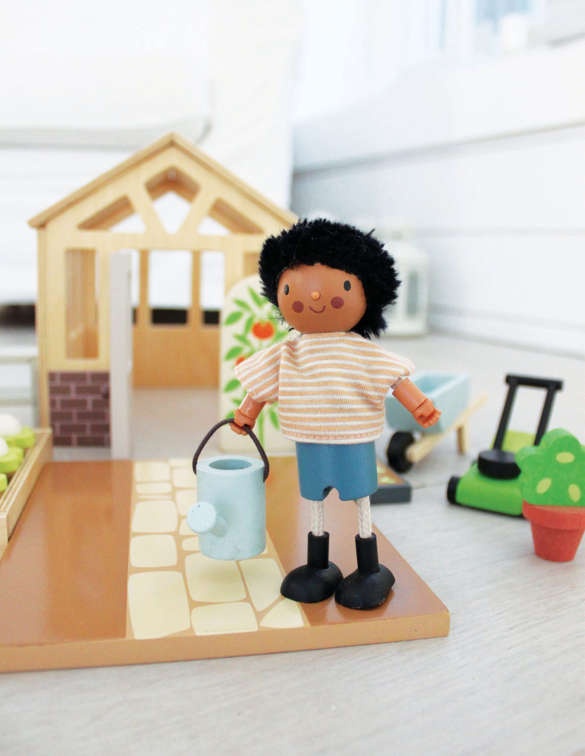 Drewniana szklarnia ma otwierane drzwi i zdejmowany dach, aby umożliwić wygodny dostęp do jej wnętrza. W środku szklarni można uprawiać warzywa – na specjalnej podstawie z grządkami. Są również rośliny doniczkowe oraz sadzonki jak i krzaczki z pomidorami! W zestawie jest wszystko do niezbędnych prac ogrodowych. Znajdziemy kosiarkę, taczkę, pojemnik na kompost jak i leżak do odpoczynku po ciężkiej pracy w ogrodzie.