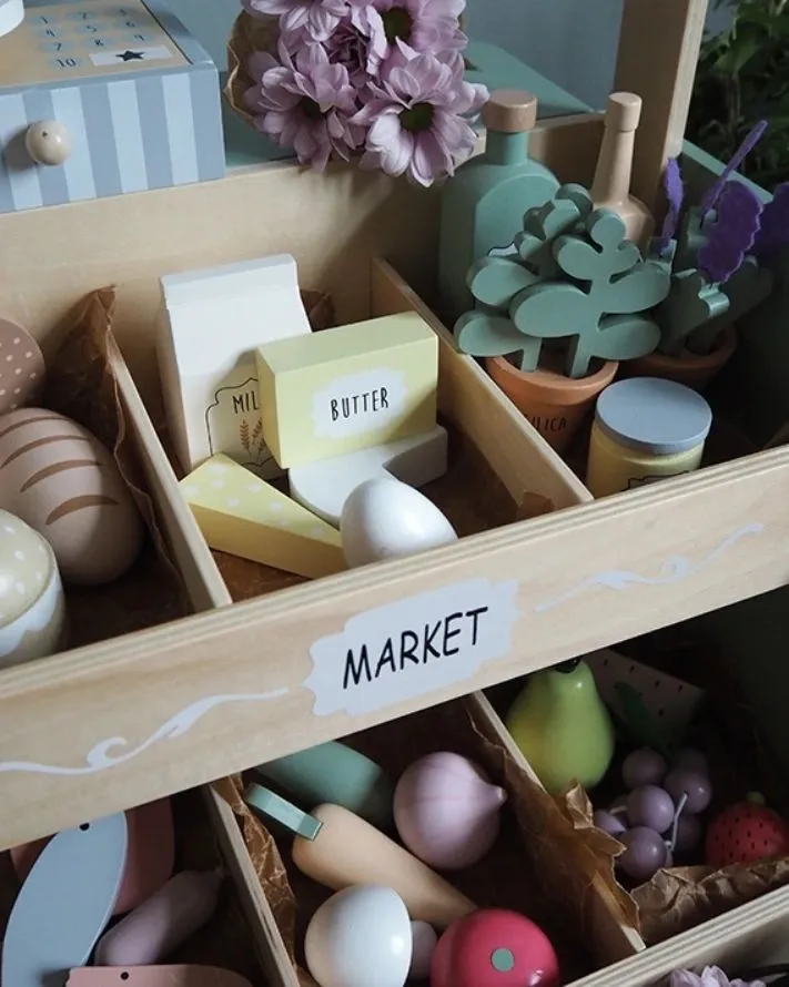 - 28 produktów spożywczych: Zestaw zawiera różnorodne produkty spożywcze, takie jak owoce, warzywa, pieczywo, mięso i ryby, nabiał, przyprawy i zioła. Dzieci mogą poznawać różne rodzaje żywności i udawać, że handlują nimi.