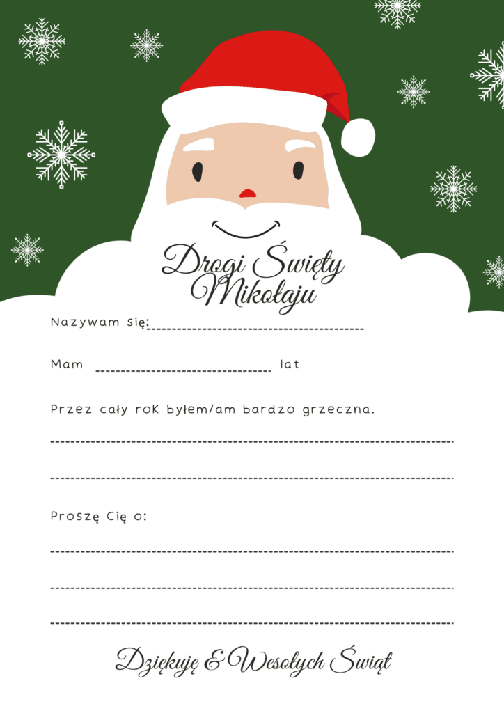 Poniżej znajdziesz darmowe szablony listów do Świętego Mikołaja w formacie PDF, które możesz pobrać i wydrukować. Wystarczy kliknąć na obrazek z szablonem.