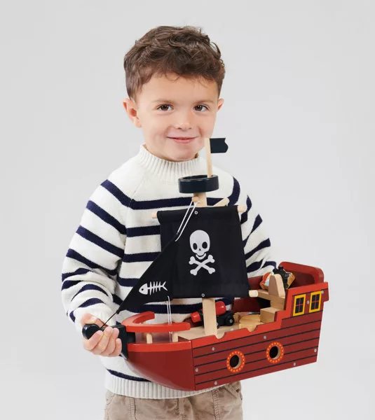 Drewniany statek z piracką załogą rusza w rejs. Wyposażony jest w trzy czarne żagle z białymi nadrukami. Dwa mniejsze żagle można odpiąć i zdjąć. Można również wyjąć cały maszt, zwiększając powierzchnię pokładu. W bocianim gnieździe znajduje się wyjmowana flaga, wykonana z drewna. Sterem można kręcić, a trzy figurki piratów można schować pod pokładem.
